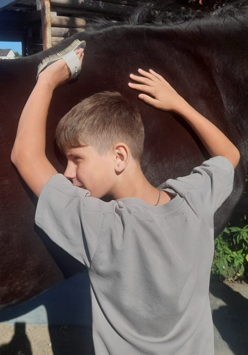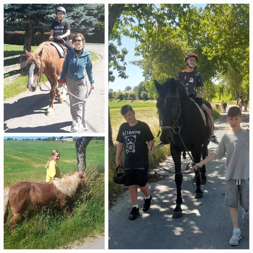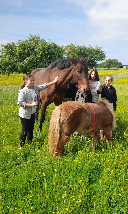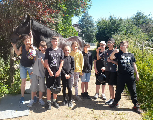 Pünktlich zum Schuljahresende haben nun alle Kinder der 5.Klassen der KBRS+ am Reitprojekt teilgenommen. Bei herrlichem Wetter wurde wieder viel über Pferde und Ponys, deren Pflege und Fütterung theoretisch wie praktisch gelernt. Schön zu sehen ist immer mit wieviel unterschiedlichem Mut und Vertrauen die Kinder mit den Tieren umgehen und sich gegenseitig unterstützen. Oft sind es Kinder, die im schulischen Kontext im Klassenzimmer vielleicht eher Schwierigkeiten haben, die im Umgang mit den Pferden plötzlich ganz tolle Stärken zeigen.